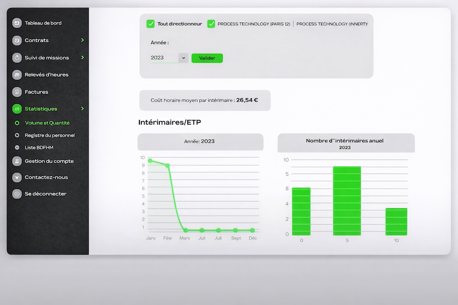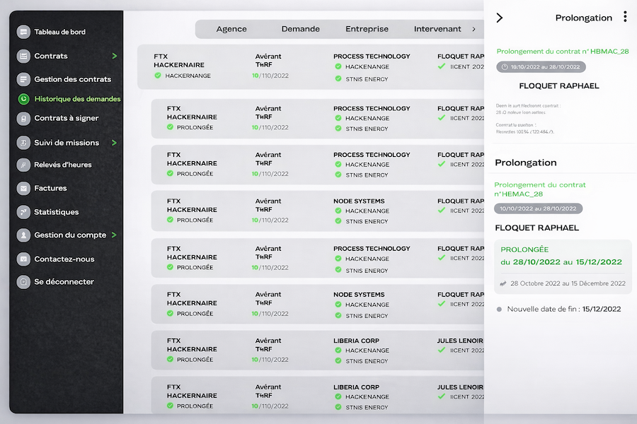 La plateforme vous apporte une vision consolidée des missions qualifiées : contrats, prolongations, suivi et historique, pour un pilotage précis et structuré.